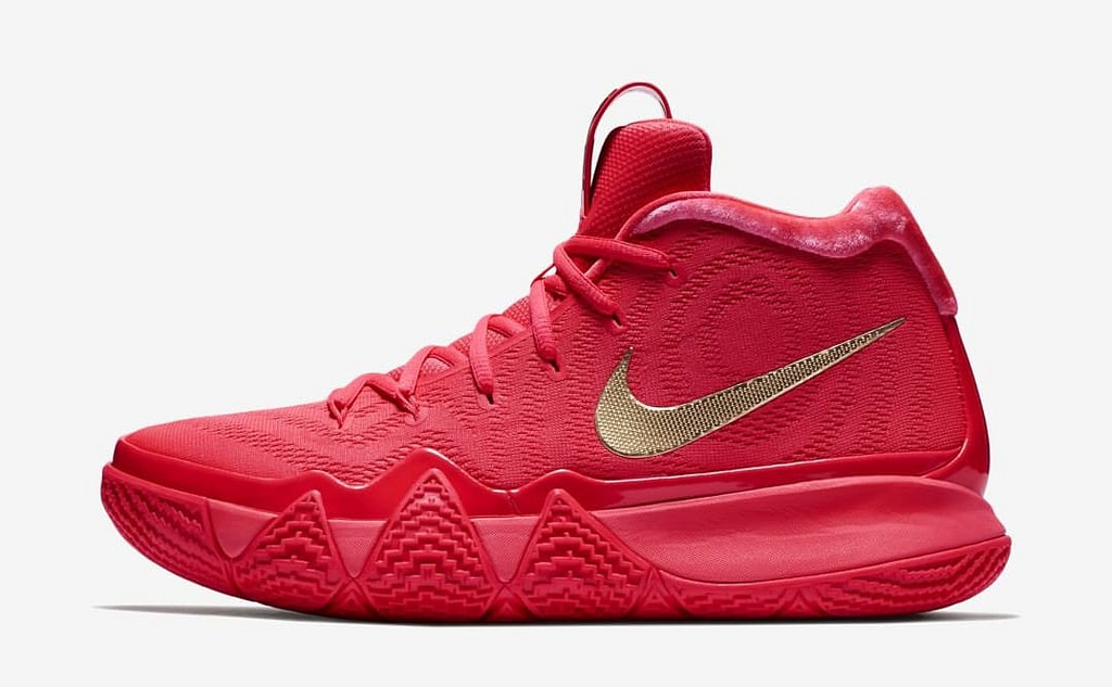 喺美國,Nike SNKRS 推出一款 Kyrie 4 “Red Carpet” ,對鞋全紅色搭金色Logo ,鞋筒內改用天鵝絨,比較特別係中上與鞋身之間加多一層漆皮,好睇之餘仲可以改善外底與鞋身甩膠問題。